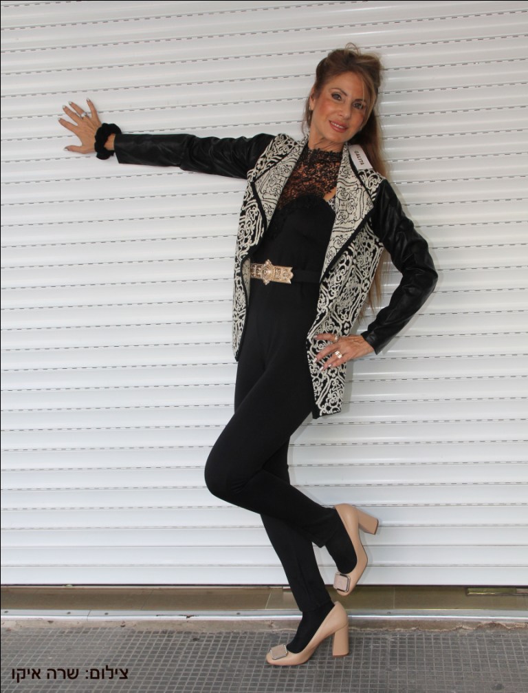 להופעת ערב מהממת במיוחד שלפתי אוברול בטוטאל לוק שחור המקושט עם תחרה שחורה וסקסית במפתח לב בחזית. מעל התאבזרתי בזקט בהדפס פרינטים בצבעי שחור, לבן וברונז כדי לשבור את המראה המונוכרומטי.