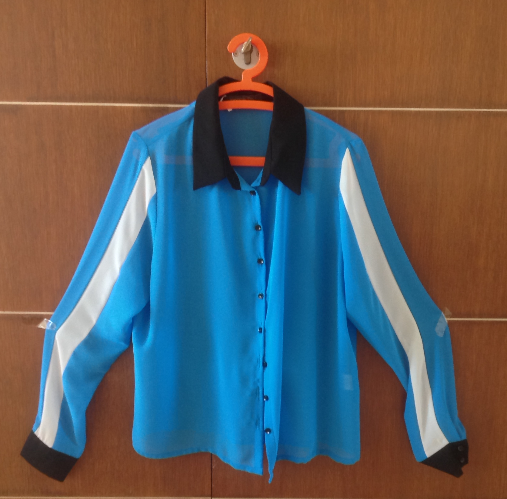 חולצה קלאסית עם טוויסט של 3 צבעים (שחור, תורכיז ולבן) ופסים בשרוול שמקנים לה מראה רענן וספורטיבי. תוכלי לשלב עם מכנסי עור שחורים, מכנסי ג'ינס או מכנסים לבנים. אפשר גם עם חצאית.