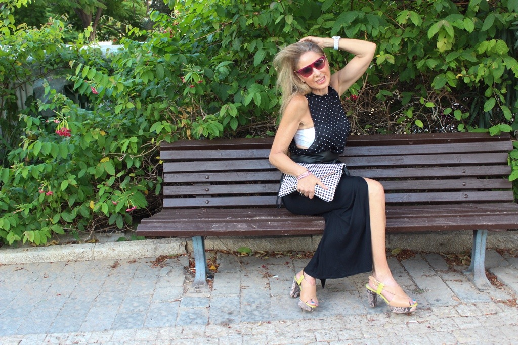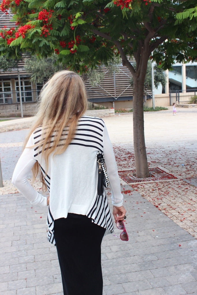 בחרתי בחצאית מקסי צמודה עם מיפתח סקסי במיוחד שמעניק מראה נשי וצללית ארוכה ודקיקה, זרקתי על עצמי קרדיגן פסים שחור לבן שאותו לבשתי מעל הגופייה האנרגטית המנוקדת והוספתי טוויסט להופעה עם תיק הדומינו שלי.